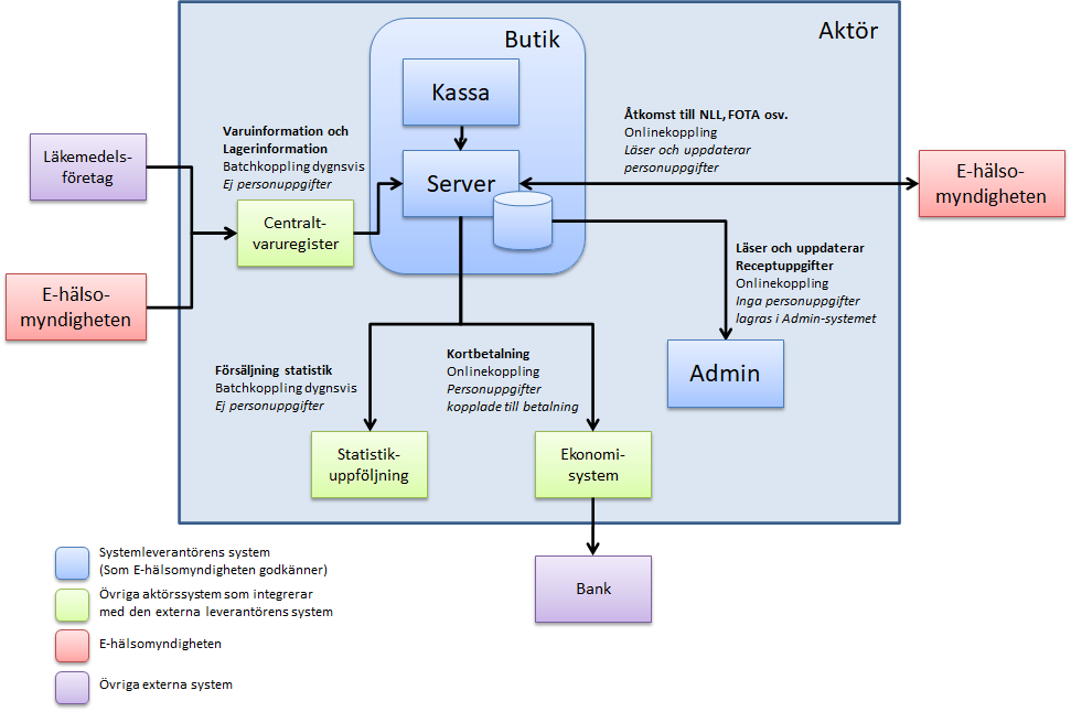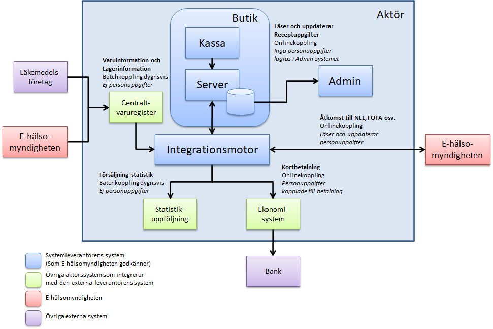 För att säkerställa att arkitekturen och säkerheten följer E‑hälsomyndighetens riktlinjer och krav är det viktigt att se helheten. Kraven omfattar därför inte enbart de system som har integration mot E‑hälsomyndigheten utan även de system som används av slutanvändaren (det som oftast kallas exempelvis expedieringssystemet, journalsystemet eller vårdinformationssystemet). Alltså ingår hela kedjan från slutanvändaren via eventuella integrationssystem till E‑hälsomyndigheten.