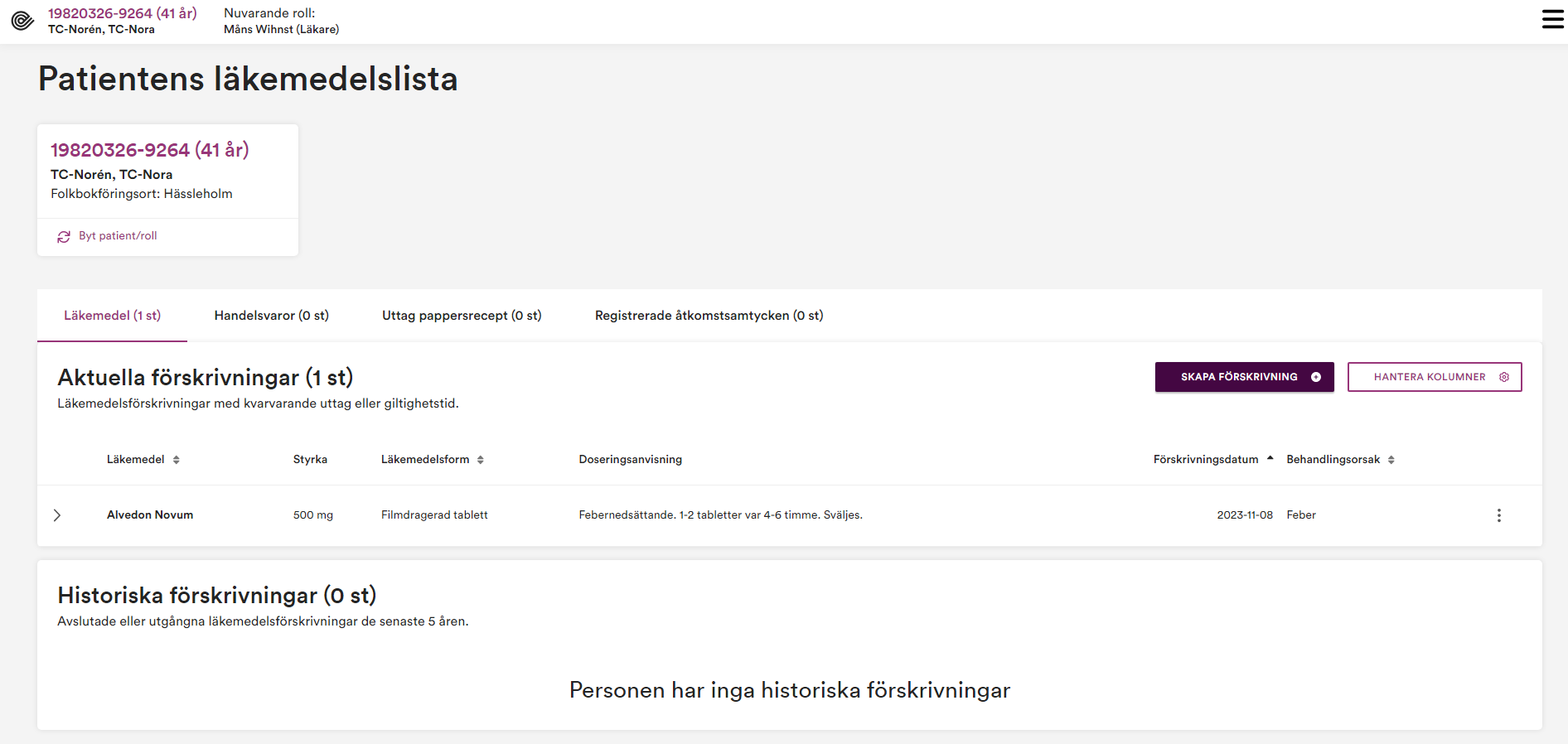 Då du gjort dina val och klickat ”Gå vidare” kommer du till en översikt av vald patients läkemedelslista, se Figur 2 nedan, och kan därefter påbörja att skapa testdata.