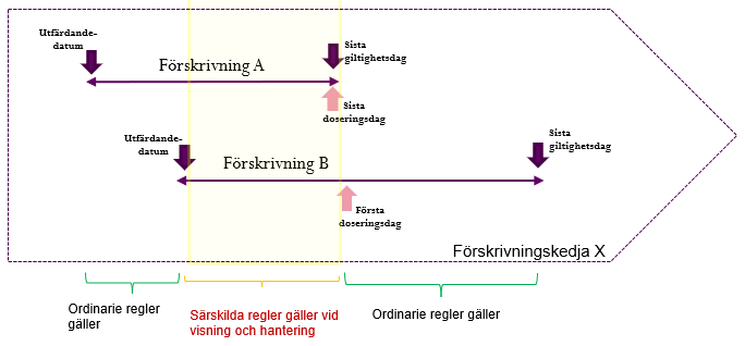 | VR174 | Kontroll av Första och Sista doseringsdag på parallella förskrivningar | Följande villkor för datum ska uppfyllas vid kontroll mellan två förskrivningar som ska vara parallella, Förskrivning A och Förskrivning B. Den först utfärdade av de två förskrivningarna benämns Förskrivning A och förskrivningen med framtida användning benämns Förskrivning B: