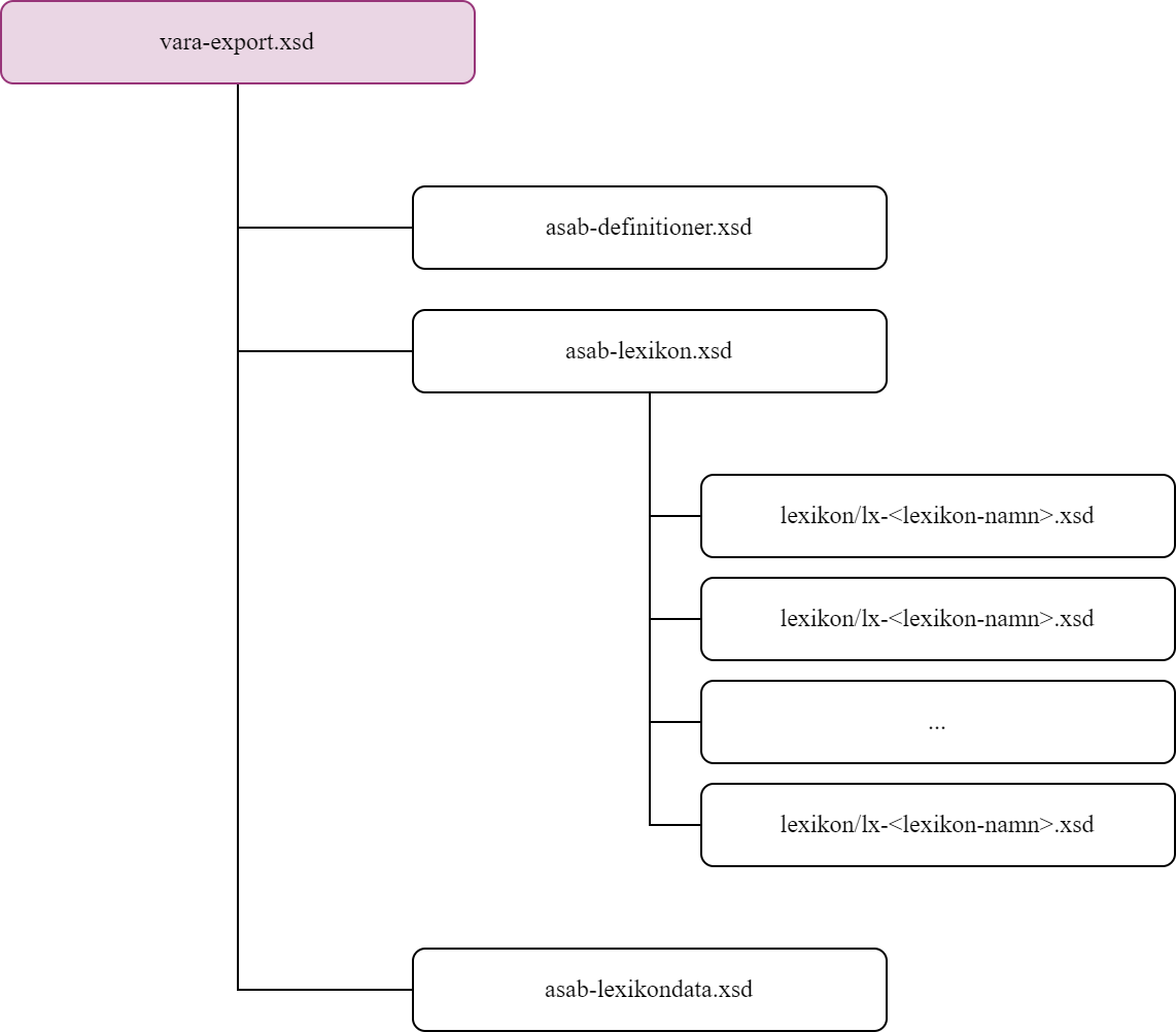 Exportformatet är specificerat i ett antal inbördes beroende xml-scheman (xsd:er), med följande struktur: