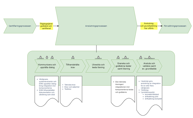 - De tester som måste genomföras för att bli godkänd för anslutning. E-hälsomyndigheten bistår med testmiljöer