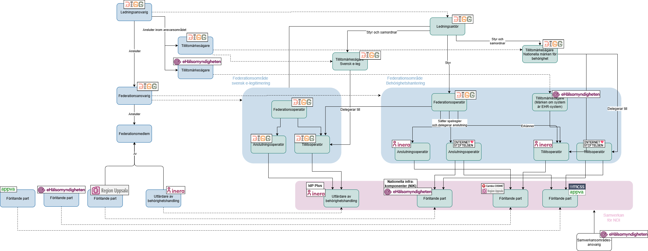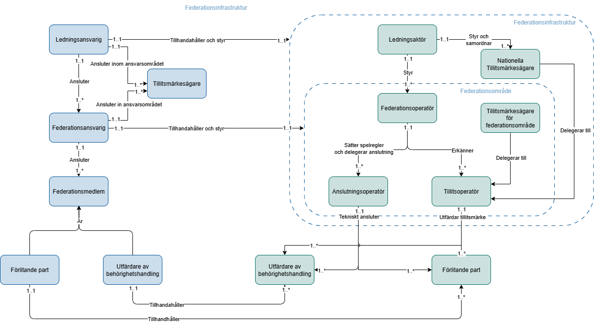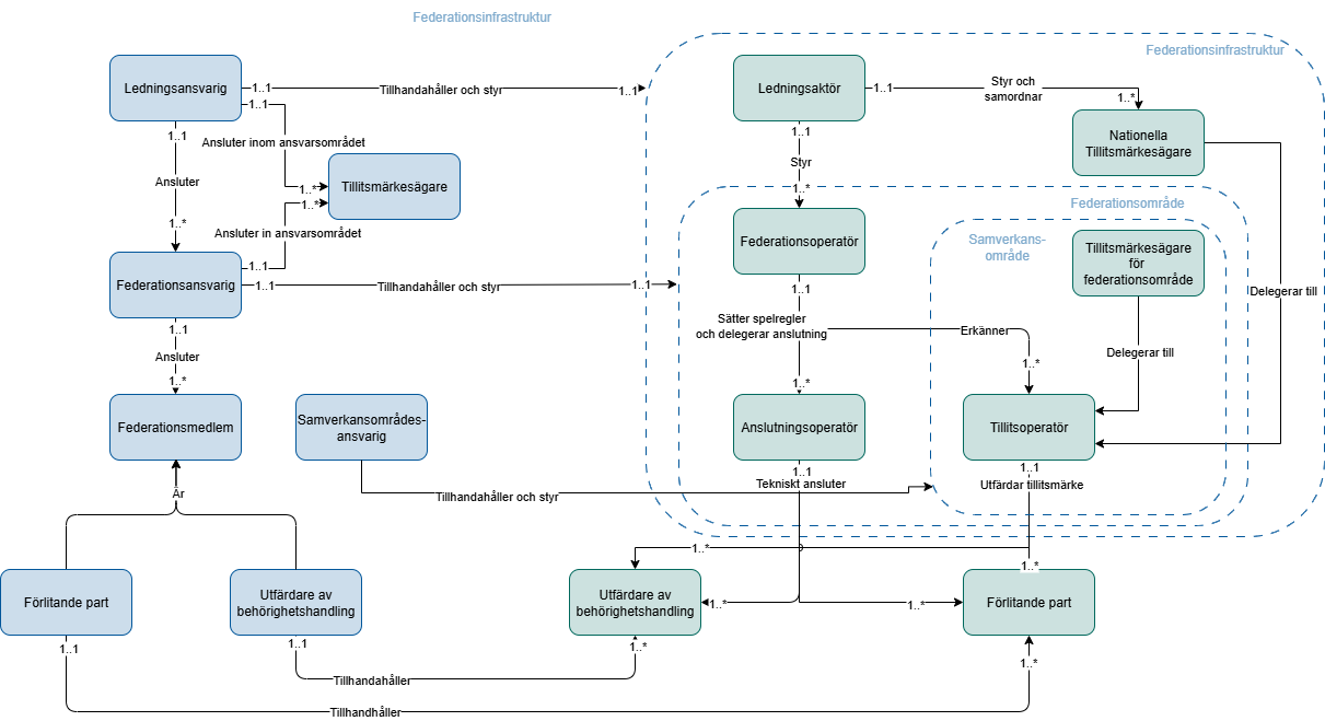 Roller som beskriver vem gör vad i praktiken. Här finns federationsoperatör, anslutningsoperatör och tillitsoperatör. Fokus är tekniska och organisatoriska processer för att federationens tillit och åtkomstkontroller ska fungera.
