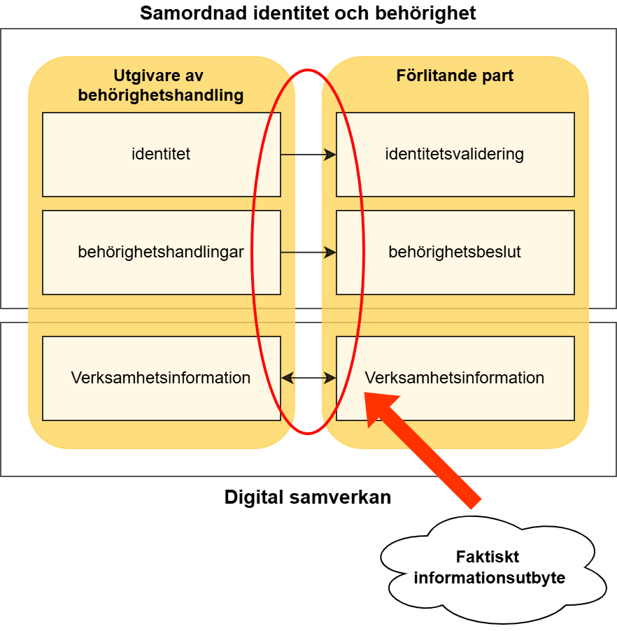 Nedan ges en konceptuell modell för hantering av identitet och behörighet vid digital samverkan, som också visar att det faktiska utbytet av verksamhetsinformation mellan samverkande parter inte regleras av Samordnad identitet och behörighet utan mellan parterna själva, för den specifika digitala samverkan som sker.