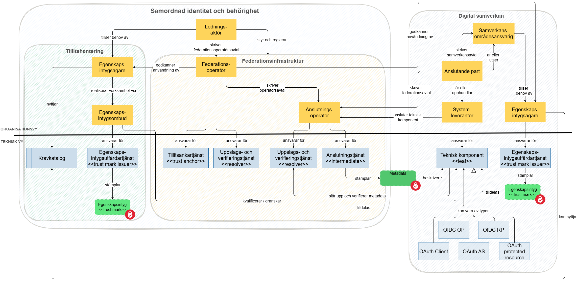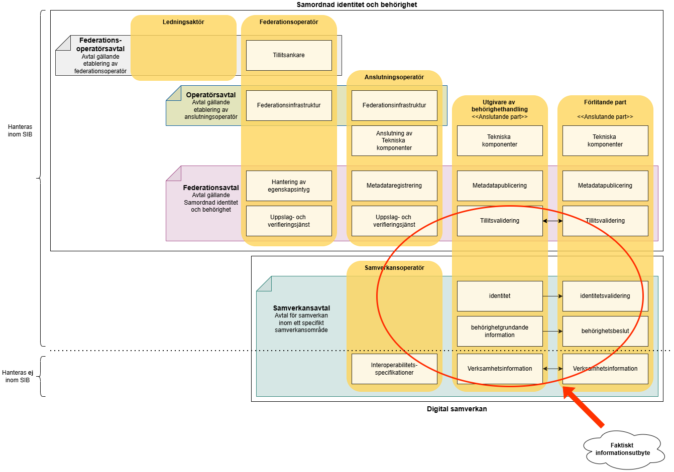 Nedan visas en översikt över strukturen av avtal som möjliggör Samordnad identitet och behörighets federationsinfrastruktur. Bilden visar också hur avtal om samverkan med faktiskt informationsutbyte relaterar till federationsinfrastrukturen.