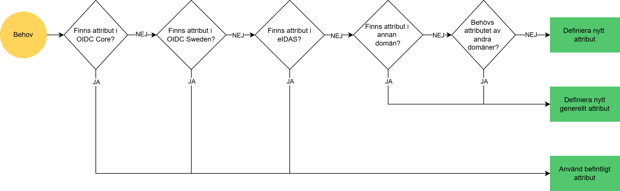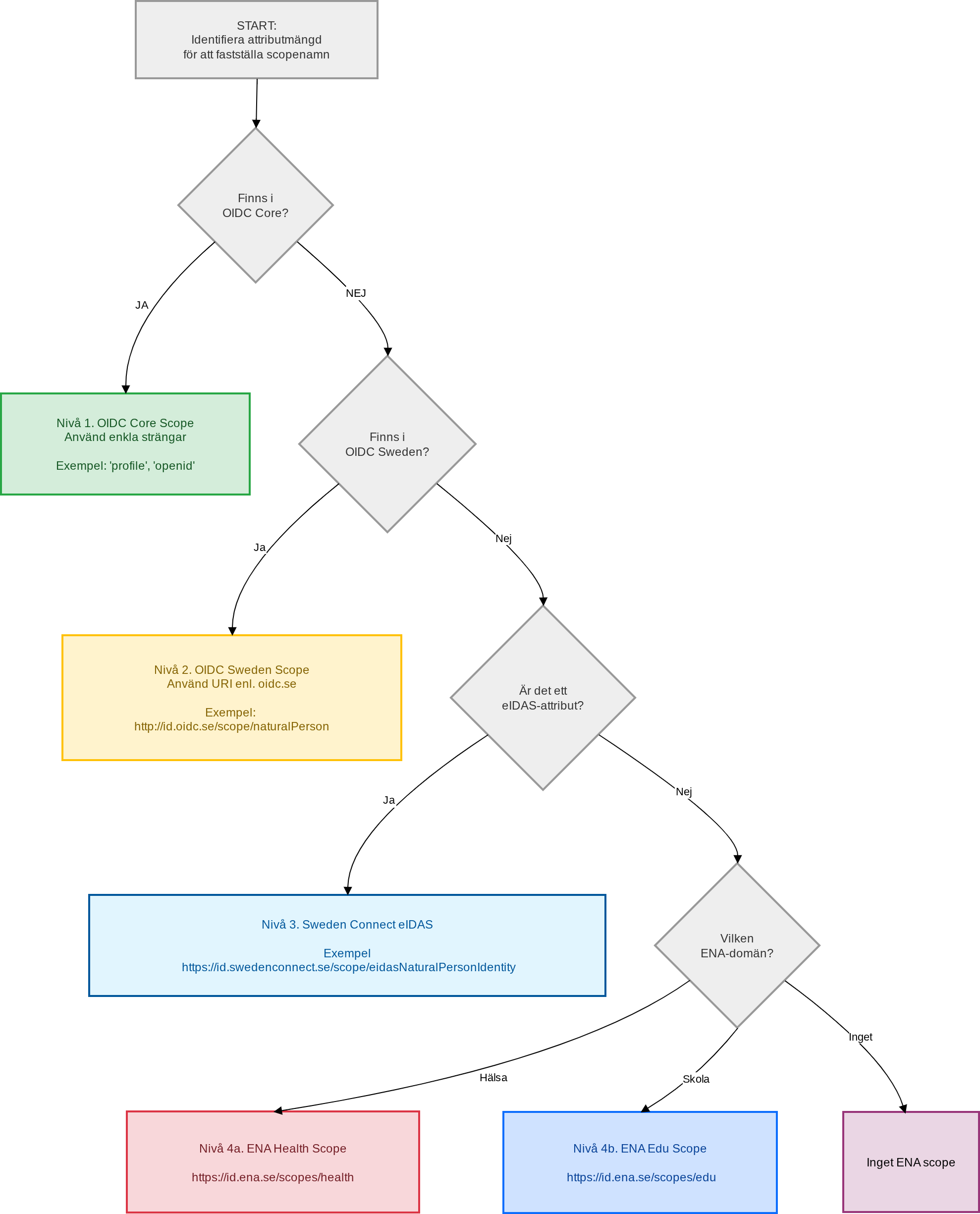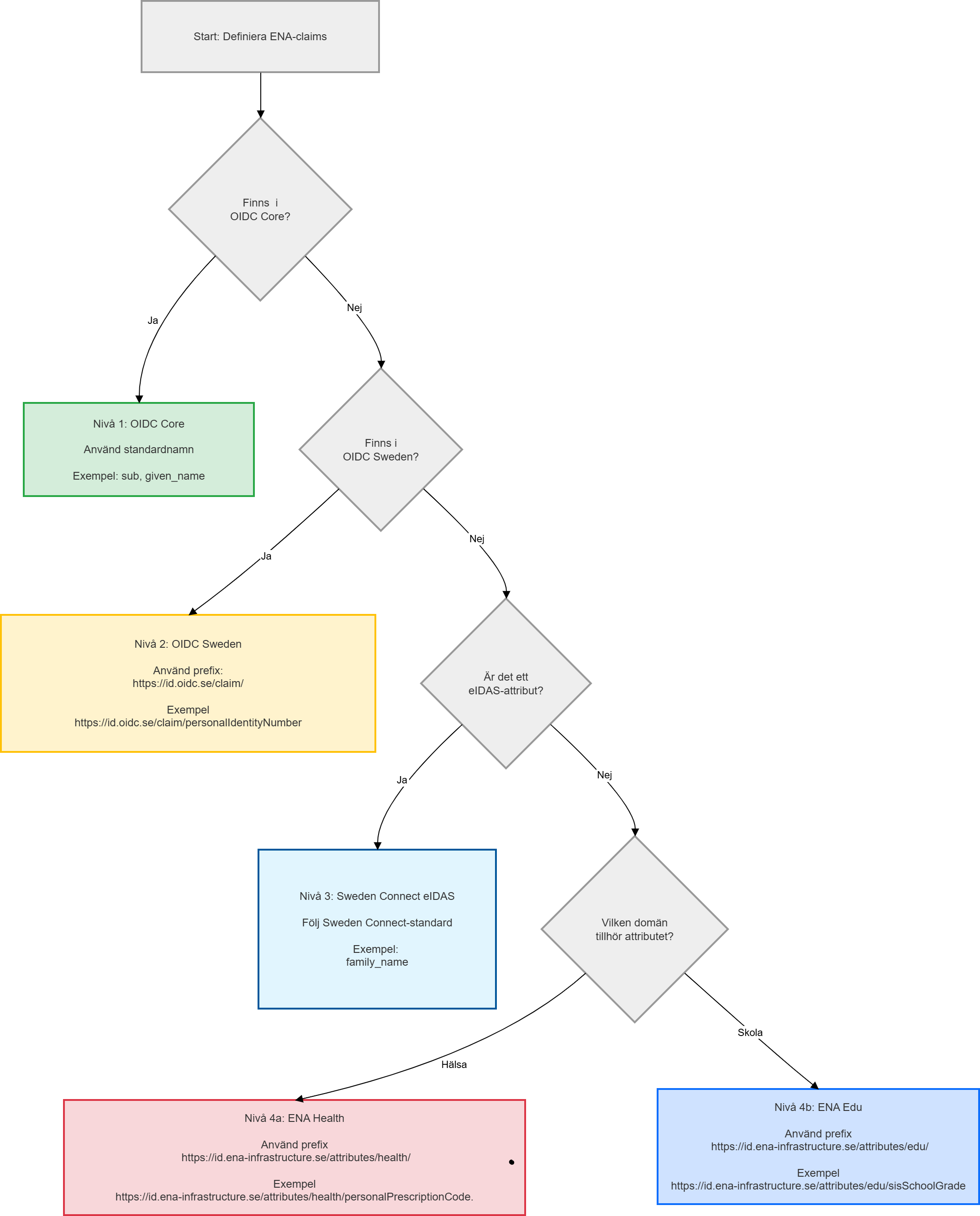 För att avgöra vad ett attribut eller claim ska heta och vilket scope ett claim eventuellt ska tillhöra, behövs en beslutsordning med hänvisning till befintliga standarder. Här har vi valt att illustrera denna beslutsordning i form av beslutsträd.