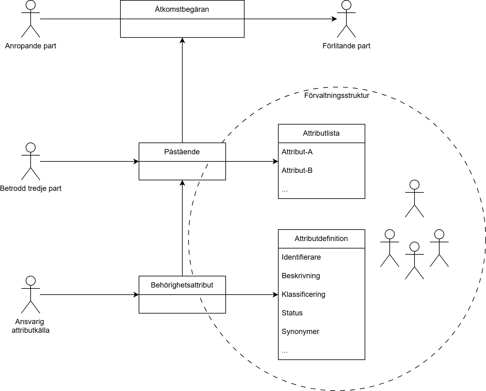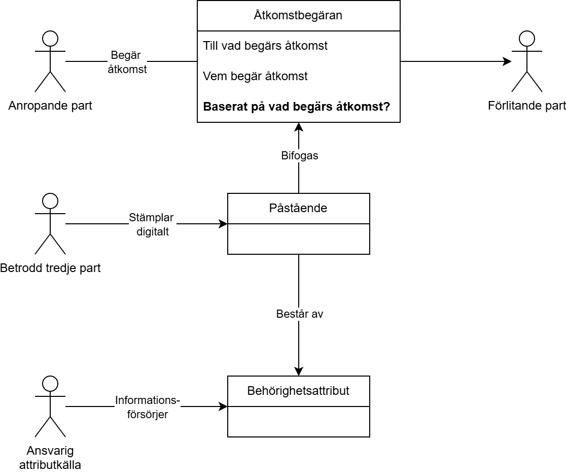 För att kunna etablera samverkan via en digital tjänst krävs att den tjänsteproducerande parten kan fatt ett automatiserat behörighetskontroll. Underlag för sådan kontroll ges i regel i form av utfästelser om identitets- och behörighetsgrundande information.. Användarens identitet kontrolleras i regel genom e-legitimering och för systemaktörer används ofta certifikat som påstår att innehavaren av certifikatet har en viss identitet. Utfästelserna (eller påståendena) om identiteter och behörighetsgrundande information för anropande system och eventuell bakomliggande fysisk användare taggas som olika attribut, paketeras enligt en attributprofil, och förses med en digital stämpel av den part som står som garant för påståendets riktighet.