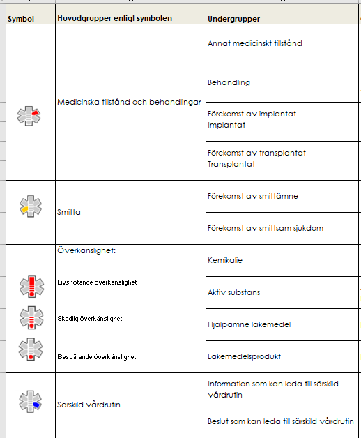 A.2.1.2.1 Healthcare alert description /Beskrivning av varning i hälso- och sjukvård | Description of medical alerts in textual format: any clinical information that is imperative to know so that the life or health of the patient does not come under threat. - /Textuell beskrivning av medicinska varningar – all klinisk information som är avgörande att känna till för att patientens liv eller hälsa inte ska komma till skada. Exempel: Exempel 1: Intolerans mot acetylsalicylsyra på grund av gastrointestinal blödning. Exempel 2: Intolerans mot captopril på grund av hosta (patienten är inte allergisk, men kan inte tolerera det på grund av ihållande hosta). Exempel 3: Patienten har en sällsynt sjukdom som kräver särskild behandling. Exempel 4: Luftvägsvarning / Svår intubation. Exempel 5: Diagnoser såsom malign hypertermi, porfyri och blödningsrubbningar; särskilda behandlingar som antikoagulantia eller immunosuppressiva medel; implanterade anordningar(implantat?). Exempel 6: Transplanterade organ illustrerar annan information som måste beaktas vid en vårdkontakt. Exempel 7: Deltagande i en klinisk prövning som måste tas i beaktande vid en vårdkontakt. | Beskrivning av hur lösningen möter EDHS krav | UMI specens undergrupper i kodverkslistan I UMI finns också huvudgruppen Smitta med undergrupperna Förekomst av smittämne och Förekomst av smittsam sjukdom | Beskrivs vanligtvis i löpande text vad , hur det ska hanteras och vilken vårdgivare som hanterar tillstånd/ bedömning. | ||||||