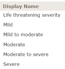 C.21.4.2 - Severity /Allvarlighetsgrad | Severity of the clinical manifestation of the allergic reaction. /Allvarlighetsgraden för den kliniska bilden vid den allergiska reaktionen | 0 | 1 | CodeableConcept | preferred | SNOMED CT | Benämning: "Allvarlighetsgrad" Snomed CT | |||