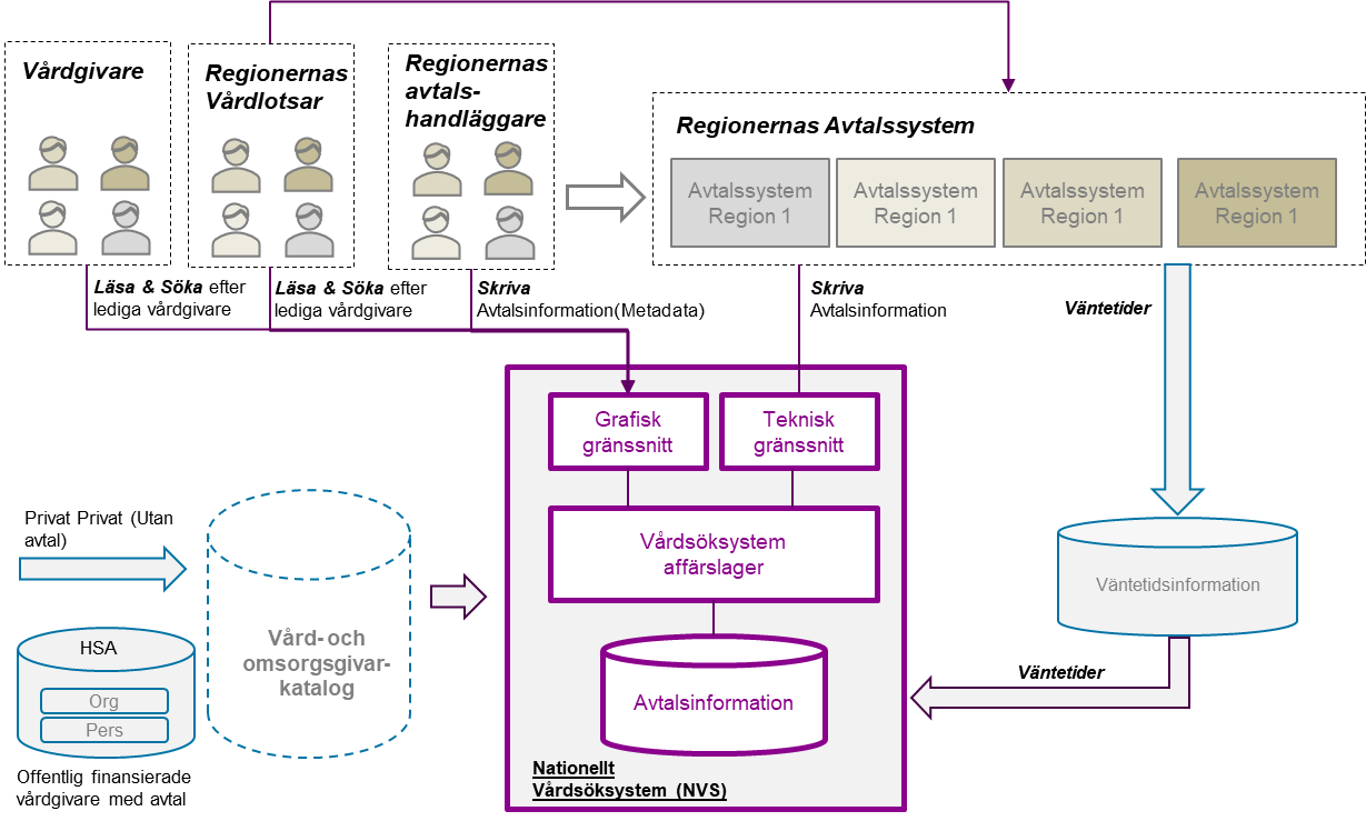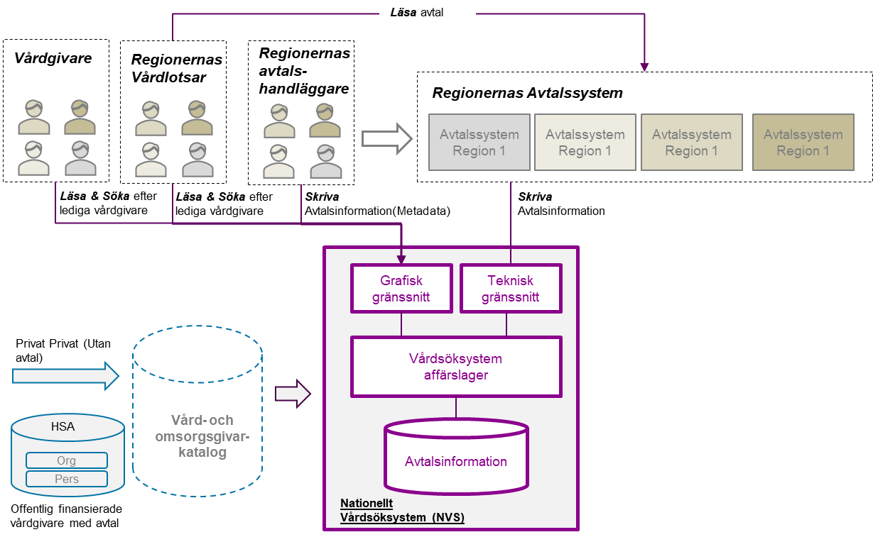 I uppdraget och Tillgänglighetsdelegationens rapport lyfts behovet fram att ett vårdsöksystem ska innehålla information om avtal med offentliga och privata vårdgivare i alla regioner samt villkor som gäller nyttjande av den vården. Detta har bekräftats och detaljerats ytterligare i behovsanalysen. De främsta behoven som lyfts fram är tillgång till information om avtal med privata vårdgivare (det är där eventuell ledig kapacitet finns) samt vilka sökkriterier och informationsmängder om dessa avtal som användarna önskar ta del av. Källan med avtalsinformation bör innehålla metadata om alla regionala avtal med hänvisning till det faktiska avtalsdokumentet som lagras hos den avtalande regionen. Strukturen för avtalsinformationen bör inte skilja sig från de lösningar med motsvarande information som kan finnas i regionerna i dagsläget och inmatning av avtalsinformation ska möjliggöras både via tekniska och manuella gränssnitt för att minska regional administration.