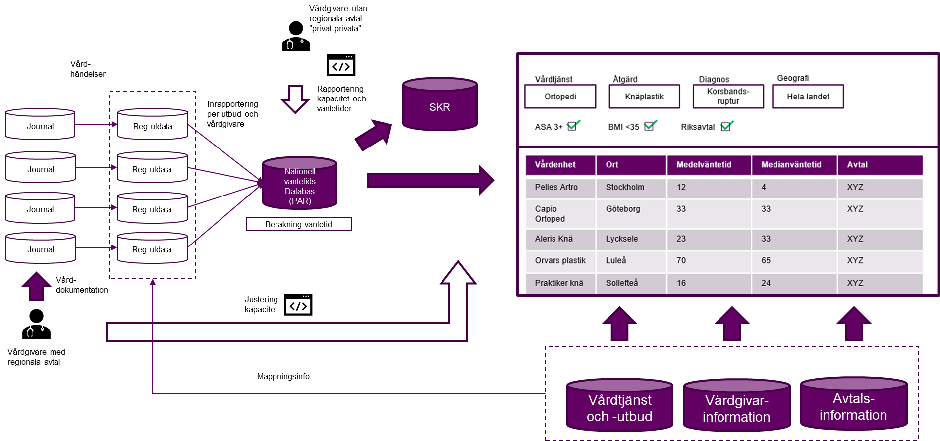 - En central databas beräknar väntetider för inrapporterade vårdenheter/vårdgivare och vårdtjänster