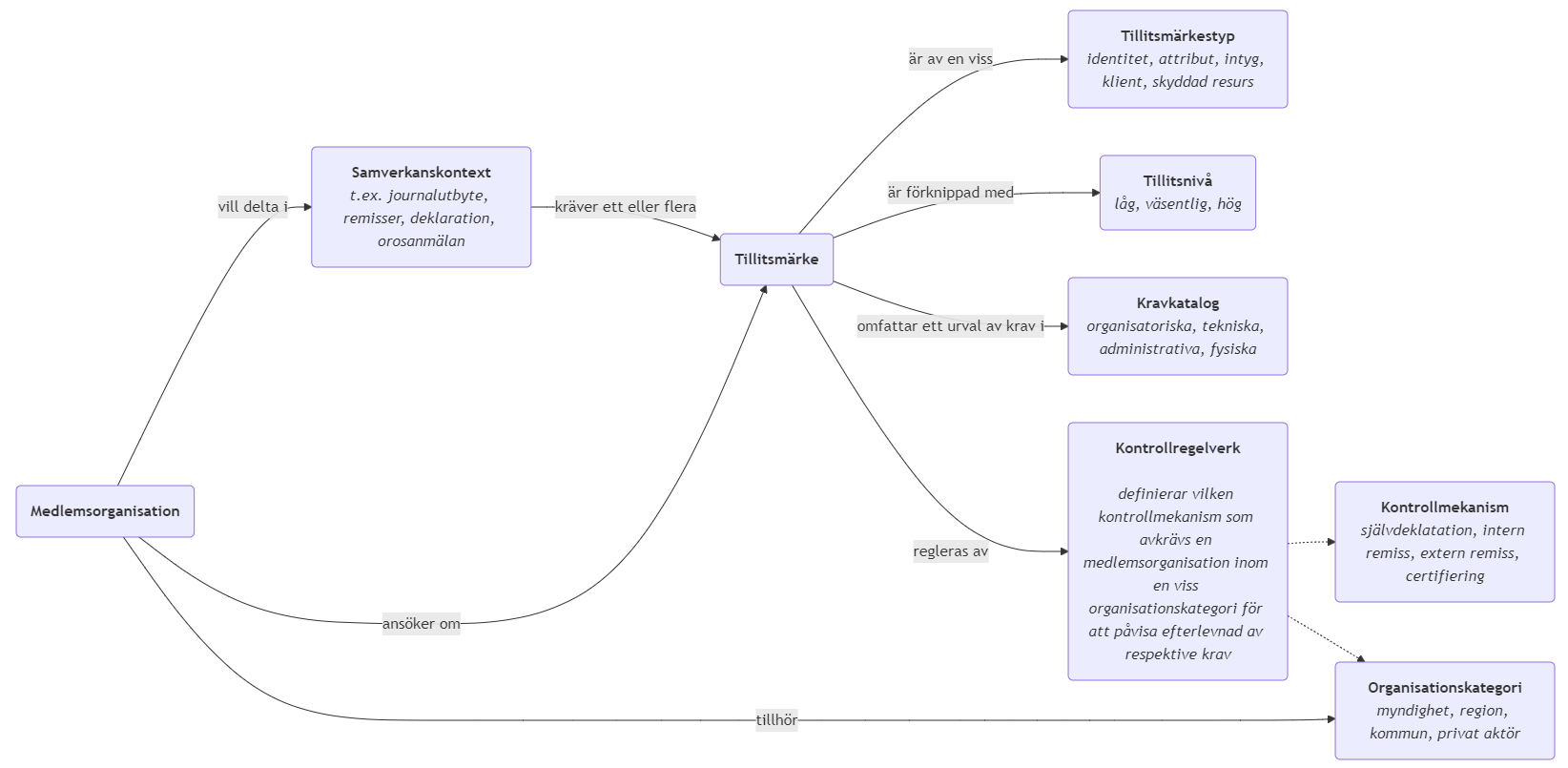 - Ett tillitsmärke utmärks av ett syfte definieras av dess typ och tillitsnivå. Det omfattar en uppsättning krav och regleras av ett regelverk som definierar krav på kontrollmekanism per organisationskategori.