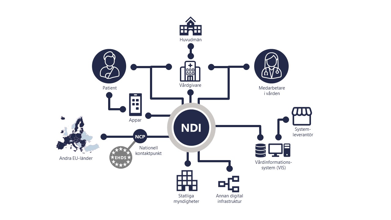 Bilden visar en översikt över aktörer som huvudsakligen berörs av den nationella digitala infrastrukturen och förordningen om det europeiska hälsodataområdet.