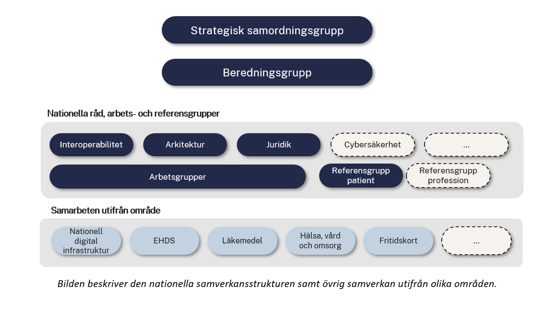 Arbetet samordnas inom den nationella samverkansstrukturen (se bild nedan). Syftet är att stärka vår gemensamma förmåga att realisera den nationella digitala infrastrukturen och identifiera utvecklingsområden som är till nytta för hela sektorn. Myndighetens strategiska samordningsgrupp har det övergripande ansvaret för samordningen.